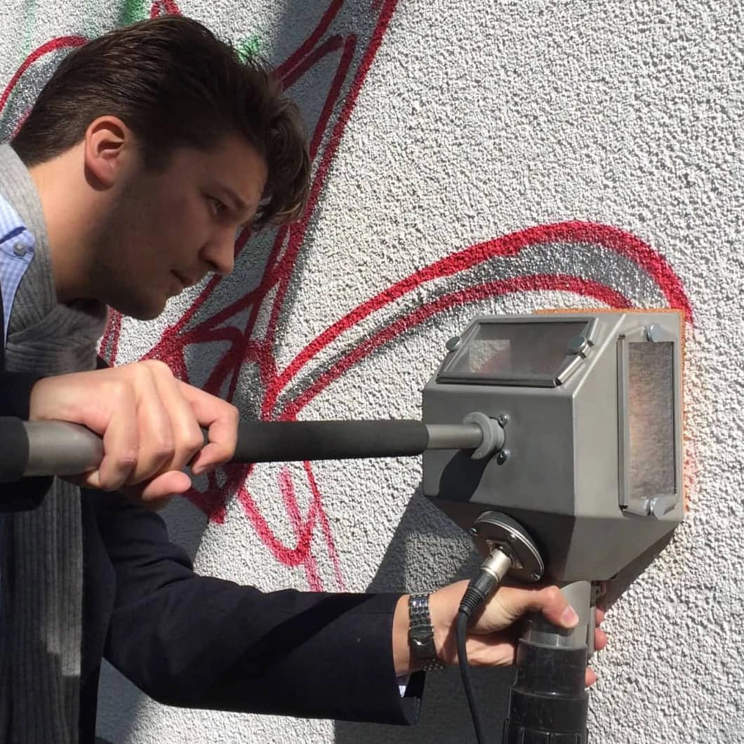Ein PUR Mitarbeiter entfernt ein Graffiti mit dem Vakuumstrahlverfahren. Man sieht die Glocke der Reinigungsmaschine.